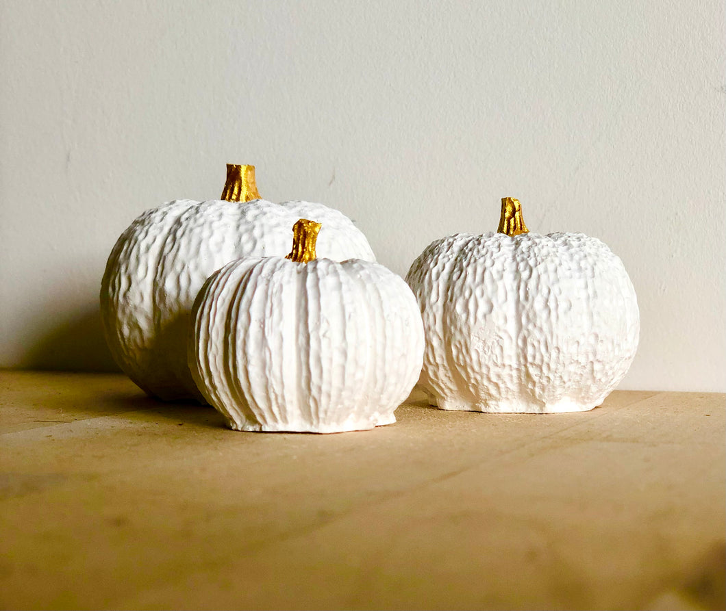 Trio of Pumpkins with Gold Stalks